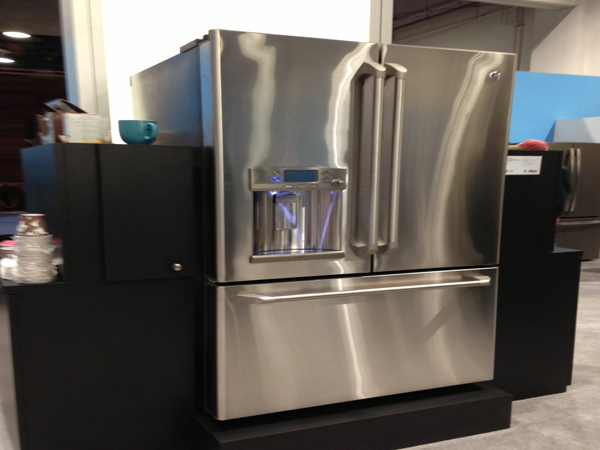 In one of the notable kitchen offerings, General Electric Co. brings hot water to the refrigerator door. The new line of Cafe French-door models can heat 10 ounces in less than two minutes. Those hoping to save steps to the microwave, though, will have to wait until the doors debut in May.