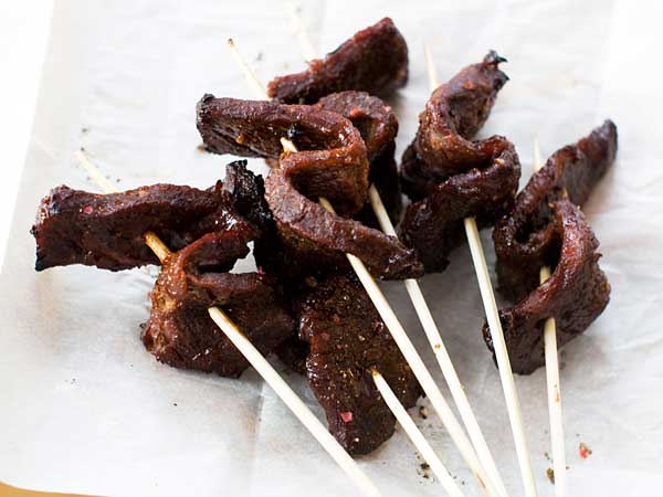 Arrange the short ribs on the rack and bake for 45 to 60 minutes, or until tender. Brush the ribs with the reserved 1/2 cup of marinade and increase the oven temperature to 450 F. Return to the oven and cook for another 10 minutes, or until browned and caramelized. Thread a skewer through each piece of meat to serve.