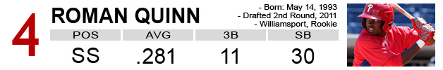 As a shortstop, a switch-hitter and a second-round pick, Quinn is bound to be compared to Jimmy Rollins, a 1996 second-round pick, as he climbs the minor-league ladder. His 30 stolen bases were six more than any player in the New York-Penn League and his 11 triples were five more than any player.